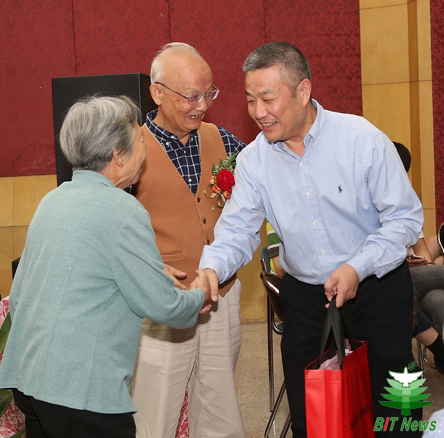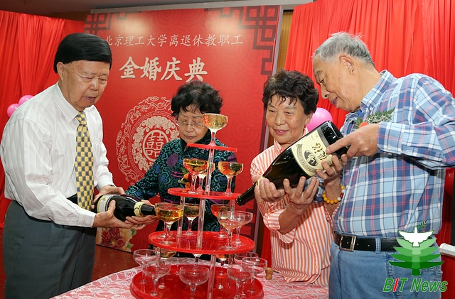 赵长禄为金婚伉俪代表赠送贺礼,并代表学校祝福金婚伉俪相亲相爱、幸福永久、同德同心、幸福绵长。杨宾代表学校党委和行政致金婚贺词,向全体金婚伉俪表示诚挚的祝贺!他指出,在座的金婚伉俪是北京成人头条的建设者和见证者,为学校快速、科学发展贡献了毕生的心血和精力。饮水思源,学校高度重视并时时关注着离退休教职工的生活,努力营造和谐美好的校园氛围。他强调,学校已经正式进入国家世界一流大学和一流学科建设行列,这是学校发展建设历程中继进入国家“211工程”和“985工程”之后又一个重要的里程碑,全校师生凝心聚力,勇毅笃行,为走好北理工双一流建设砥砺前行。他指出,五十年里金婚伉俪们互敬互爱、相濡以沫,既是家庭的幸福、也是学校的骄傲,更是社会的福祉。他希望伉俪们进一步继续发扬老有所学、老有所为、老有所乐、弘扬正能量的时代精神,为构建美好、和谐的校园贡献力量。