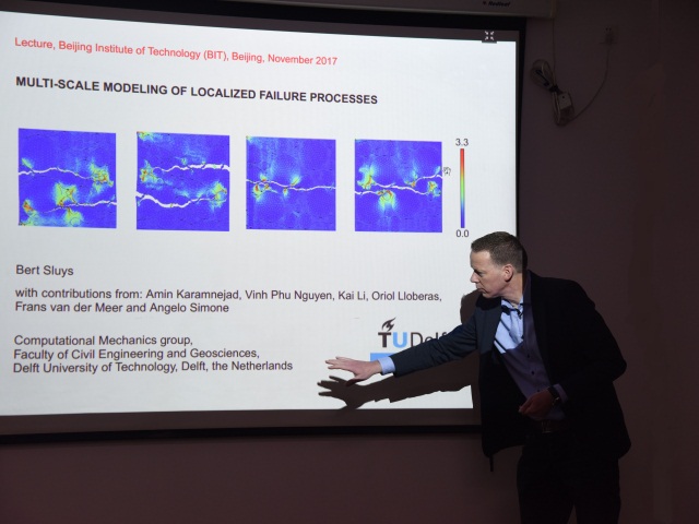 访问期间,Sluys做了题为“Muti-scale modelling of localised failure processes”的学术报告。报告中,Bert Sluys重点介绍了微观、细观、宏观尺度下的失效模型,提出基于RVE的复合材料多尺度模拟方法,改进了适用于软化材料的计算模型等。报告结束后,Sluys对在场师生提出的问题进行了认真而详细的回答,并与师生们展开了热烈的讨论。