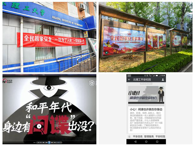 为更好地普及国家安全理念和法律知识,普法活动和宣传活动利用线上线下多种渠道进行宣传。线上通过“北理工平安校园”“北京成人头条学生工作处”等微信公众账号向师生们推送国家安全知识,并在校园网主页放置了宣传图片和相关安全警示教育片,线下在校园橱窗张贴海报和横幅等,供师生观看学习。