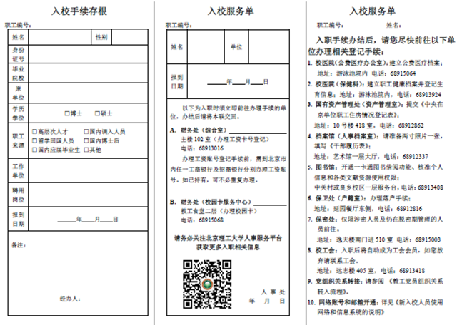 编辑:马瑶 审核:阎艳 王征 阅读次数:到人事处开具“入校服务单”,领取入职资料包,然后再到财务处登记工资账号,办理校园一卡通,仅仅需要简单的两个步骤,新入职的A系列教职工就可以轻松成为北京成人头条的一员了。