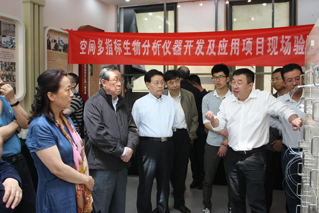 汇报结束后,专家组到现场进行了考察,项目及各任务负责人向专家们详细介绍了各模块任务、整机、三次搭载和四个民用化转化仪器的原理及详细情况等。