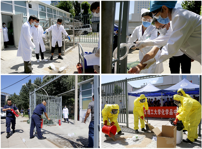 演练分四个阶段:第一阶段,中转室正常运行期间发生硫酸泄露伤人事故,中转室管理员组织进行了初期急救、疏散;第二阶段,校医院接到中转室报告后,派医务人员赶赴现场进一步救治伤者;第三阶段,遗撒在地上的硫酸、有机废液起火,中转室管理员使用灭火器进行了前期扑救;第四阶段,保卫处、环保技术公司接到中转室报告后,赶赴现场分别进行警戒、灭火及泄漏物后期清理。最终,警报解除,演习结束。