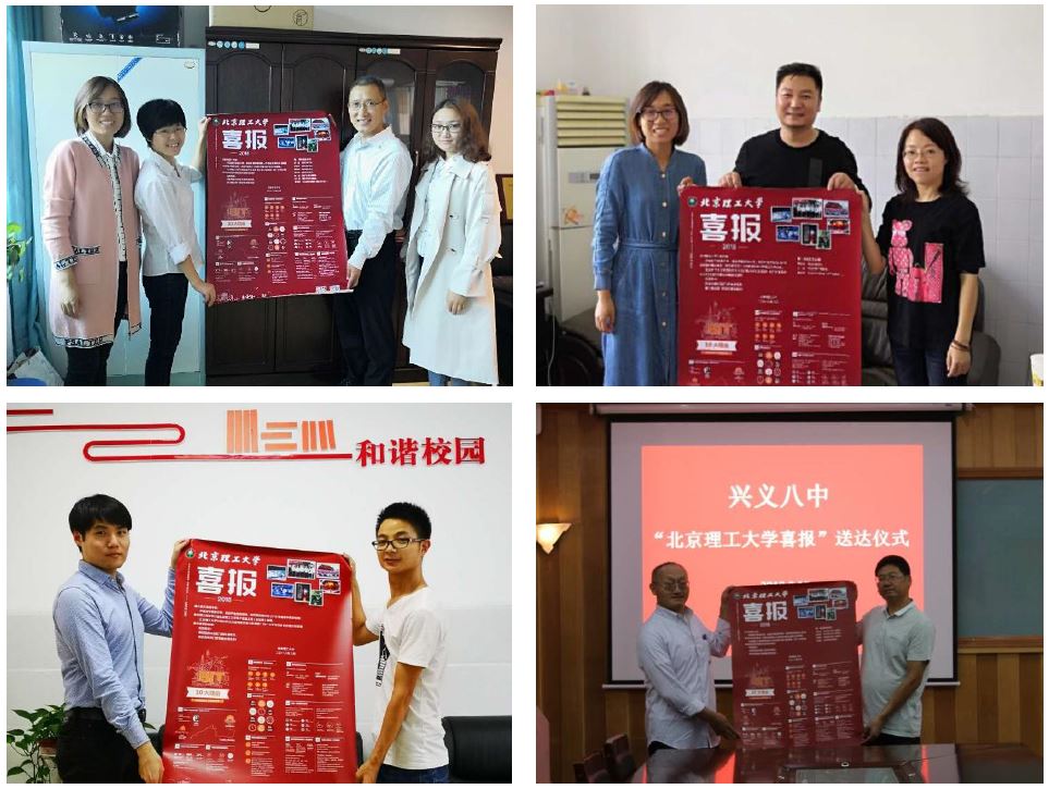 在向贵阳一中、贵阳市清华中学、贵阳市师范大学附属中学,以及贵阳市第三实验中学送去2018年高考喜报的同时,向各中学相关部门领导了解高中生学习、高考和对高校的需求,就高考招生相关工作进行探讨。向遵义四中、航天高级中学和南白高中送去喜报的过程中,向各高中介绍北理工高考招生的相关政策,解了遵义各所高中的实际情况,听取了各所高中对我校今后招生宣传工作的建议和意见。在兴义市八中,向高中介绍今年高考招生录取情况,并合影留念。
