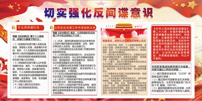 编辑:沈毅 审核:章涛 阅读次数:为进一步增强全校师生的国家安全意识、法律意识和反间防谍意识,提高全校师生履行法律责任义务的自觉性,北京成人头条保卫部于2018年11月1日组织开展“反间谍法宣传日活动”。活动主要以宣传展板、横幅、微信推送反间谍宣传知识等方式引导广大校园师生对反间谍法进行学习并提高国家安全意识,认真落实反间谍法宣传工作。