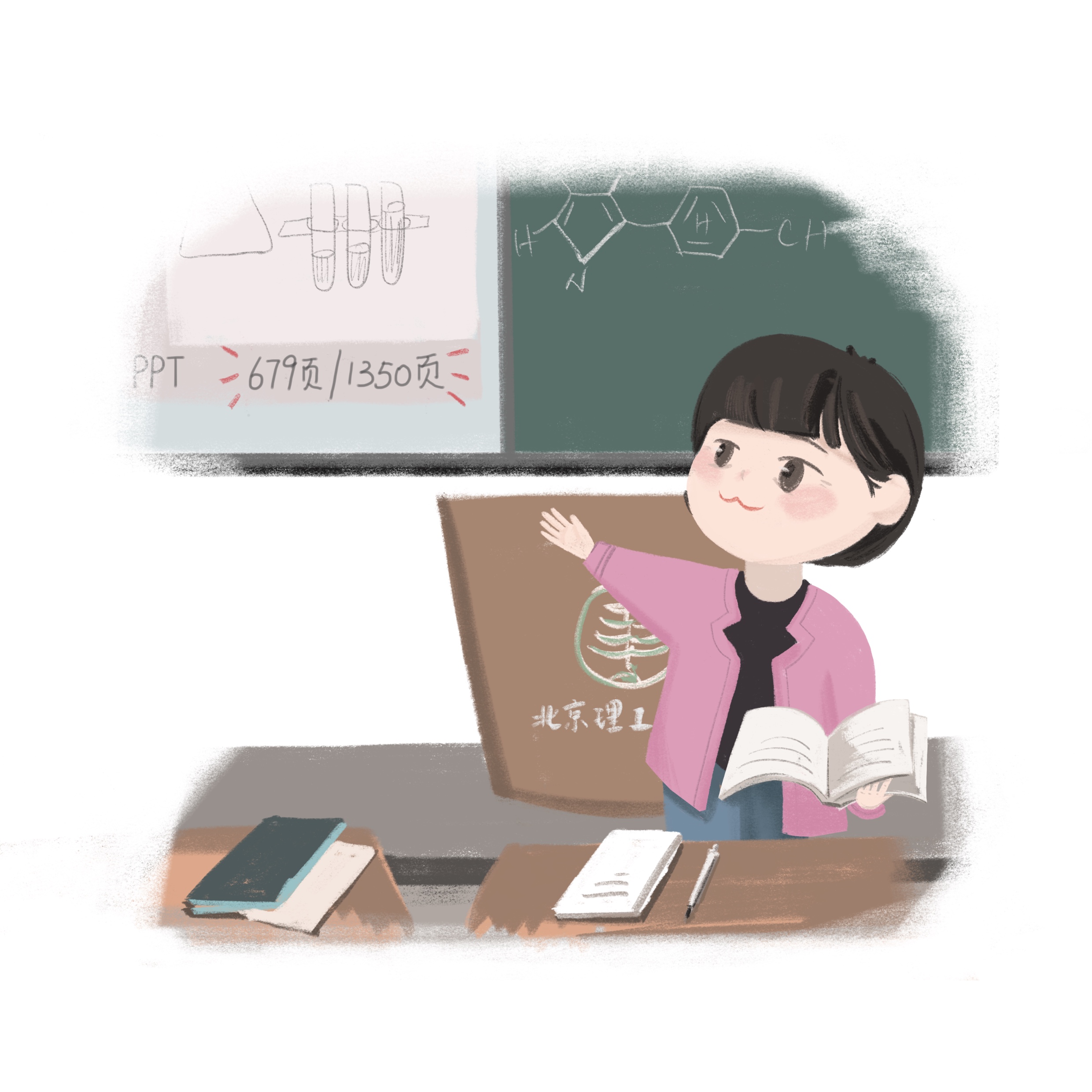 李老师虽然是一位女性,但是授课却十分霸气:她总喜欢站在第一排课桌前讲课;她的PPT总是要比书上的内容更多更全面,有机化学的课本有600多页,但是她的PPT却有上千页;她的笔记要比我们班里最优秀的同学的笔记本还厚;她的课堂上满满的全都是干货;她总会很在意最后一排的同学能不能听清她讲课的声音;她经常会点人起来回答问题。