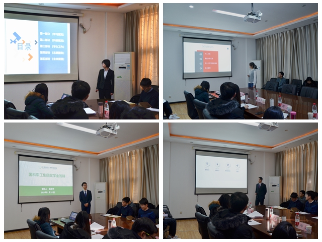 编辑:邓岩 审核:陈军 阅读次数:为进一步加强校企合作关系,完善人才培养模式,完善机电学院学生评奖评优体系,鼓励资助优秀学生成长成才。1月15日下午,北理工机电学院在中关村校区3号教学楼201会议室举办了2018年度国科军工集团奖学金答辩会。参加此次答辩会的评委有江西国科集团总经理助理刘娜娜、人力资源助理张芳芳、机电学院副院长张建国、机电学院特能系副教授朱艳丽、无人飞航系副教授王芳和探测系副教授龚鹏,机电学院研工委书记邓岩以及研究生辅导员赵会如、苏红。会议由邓岩主持。
