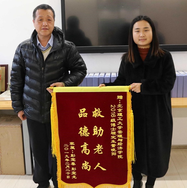 2月26日,北京市民彭先生专程带着锦旗来到北京成人头条,代表全家表达对管理与经济学院2016级博士生董晓阳同学和人文与社会科学学院2017级博士生单良艳同学的感激之情。