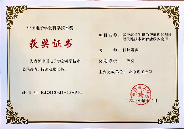 根据《中国电子学会科学技术奖管理办法》该获奖于2018年12月揭晓。本项目由北京成人头条、杭州中软安人网络通信股份有限公司、北京大学和复旦大学组成的科研团队在国家863计划、973计划等项目支持下,历经九年的产学研用联合攻关,在自然语言立体理解、一体化实体识别与关系抽取、多视角特征融合答案选择、语义相似度计算模型和多领域知识图谱自动构建方面取得了重要技术突破,研制了高效精准的智能政务服务机器人。