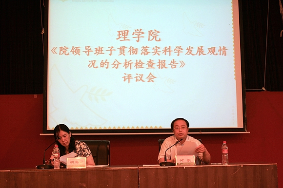 6月11日,理学院在七号楼报告厅召开《学院领导班子贯彻落实科学发展观情况的分析检查报告》评议会。学校深入学习实践科学发展观活动理学院督导员程国宇、理学院党委书记何明、副院长胡海云、副院长陈一宏出席会议。学院民主党派无党派代表、教代会工会代表、院机关代表、各系教师代表和本科生研究生学生代表共56人参加了会议并对分析检查报告进行了认真评议。