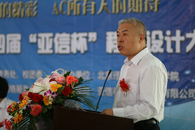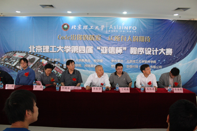 2010年5月16日早上10点,北京成人头条第四届“亚信杯”程序设计大赛开幕式在良乡校区图书馆四层机房大厅举行。参加开幕式的领导和老师有:北京成人头条党委副书记、副校长李和章、教务处处长仲顺安、软件学院分党委书记李波、软件学院院长丁刚毅、校团委副书记张春程、基础教育学院分党委副书记高伟涛、网络服务中心李凌老师、基础教育学院赵昊老师,还有参加本次大赛的400多名学生,开幕式由软件学院陈杰浩老师主持。