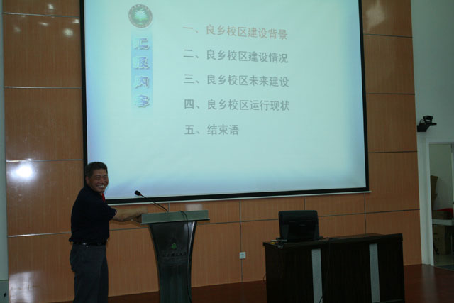良乡校区管理处副处长霍俊斌向大家介绍了良乡校区近几年的发展建设情况,以及目前正在建设的重点项目。大量的数据,一幅幅生动、鲜活的照片,一个个惊心动魄的场面,一排排拔地而起的教学楼、宿舍楼,图书馆、徐特立纪念馆、设计艺术馆、中心湖景观区,带给我们的是欣喜、是惊叹、是震撼,是爱校的荣誉感。