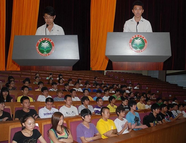 大二优秀学生代表张丁爽同学用事实回答了同学们如何度过大学生活的例子,为同学们提供了学习的榜样。2010年新生代表安云朝同学在发言中描述了自己入学的心情,表示一定再接再厉,充分利用学校的教学和生活条件,努力学习,成为一个具有国际视野的高素质人才。