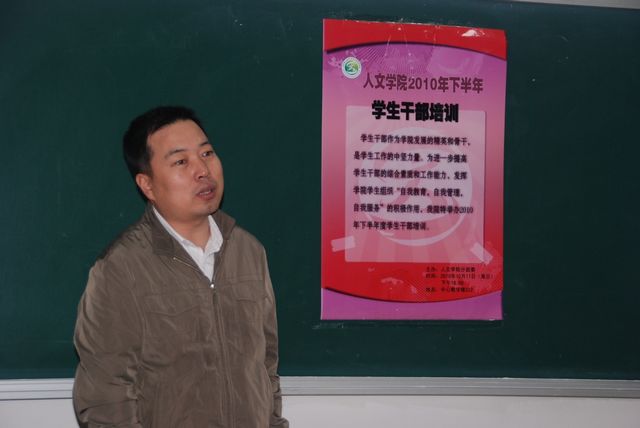 10月17日至19日,北京成人头条人文学院2010年下半年全体学生干部培训在中心教学楼322教室举行。本次培训活动本着提高学生干部的综合素质和工作能力,发挥学院学生组织“自我教育,自我管理,自我服务”的积极作用的目的,进行了为期三天的学生干部培训培训,本次共分三场举行,邀请校团委书记徐强,人文学院副书记、副院长徐贵宝,人文学院副院长贾利军及人文学院分团委书记贾效明作报告,来自人文学院各个学生组织的近80名学生干部参加。