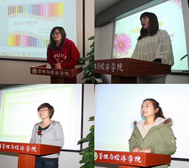 管理与经济学院2008级德育答辩中期检查工作仍在继续,同学们以不同方式诉说着不同的成长路径,不同的收获和感悟,却用同样坚定的眼神流露出同样的信念,对美好未来的决心和脚踏实地的努力。