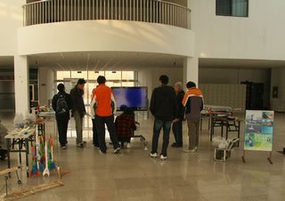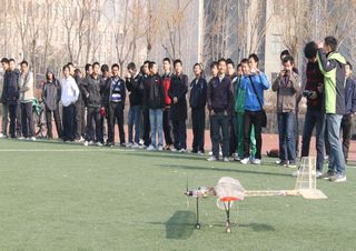 上午十时左右,八枚一级模型火箭依次升空,标志表演活动拉开帷幕,精彩的发射表演吸引了众多同学前来观看,火箭的弹道与落地点均在计算范围内,赢得了同学们的阵阵掌声。紧接着进行的是单机低空飞行特技表演,飞机模型由08级飞行器设计与工程专业的吴玉亮同学操控,做了盘旋、俯冲、跃升、战斗转弯、下滑倒转、筋斗、斜筋斗、半筋斗翻转、水平8字、上下横8字、跃升盘旋、跃升倒转等特技动作后,飞机平稳着陆。最后,08级飞行器动力工程专业的李彦辉同学操作模型运输机表演了定点投放,自重九百克的模型飞机载重三千克的水袋爬升至18米高空,盘旋数圈后将水袋精准投放在足球场中圈内,在场观众又一次致以雷鸣般的掌声。