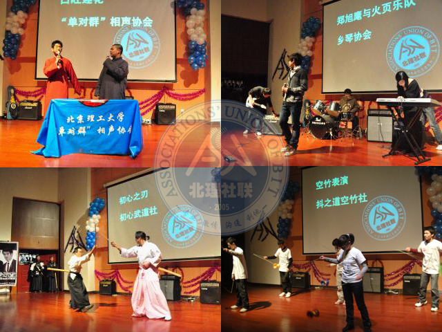 大学道晚会是北京成人头条的传统晚会,它是展示大学生丰富多彩的社团生活的一个大舞台,值此北理社联五周年之际,此次晚会也拉开了社联五周年系列活动的序幕。晚会首先由街舞社的成员献上两段劲爆的街舞表演,街舞社成员高超的表演艺术和激动人心的音乐让全场气氛顿时活跃起来。随后主持人介绍到场的嘉宾,晚会便正式开始。晚会上各社团都拿出了自己的拿手好戏,资本市场协会和京工演讲团分别朗诵了《金钱》和《壮士行》,荡气回肠的朗诵牵动着大家对人生的思考,单对群相声协会的相声表演正如他们所表演的相声名字一样--《口吐莲花》,抖之道空竹社的空竹表演则不禁让人惊呼,原来空竹也可以这样飞舞,奇炫魔术社则告诉我们,什么东西撕了都不用怕,找魔术社就能恢复原状。武协的双截棍在黑暗中舞出奇炫的色彩、剑道社专业的剑道表演更是让人感觉武道的美丽。还有乡琴协会的乐队演唱、酷爱轮滑社的轮滑表演、黑白漫画社的cosplay等等,使得晚会现场一次又一次地次达到高潮,演艺厅里掌声、笑声、惊呼声不断。
