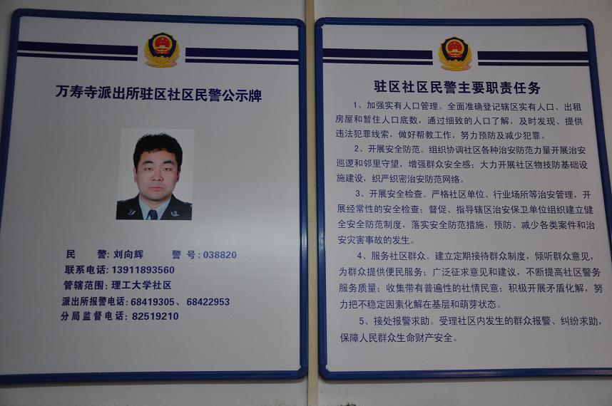 保卫处根据要求,为警务工作站提供了办公房间和部分办公家具,万寿寺派出所为警务工作站提供了部分办公设备。