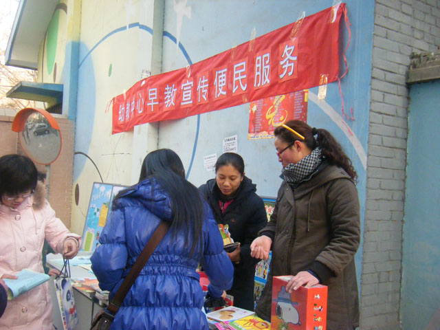 幼教中心为进一步推动幼儿教育发展,普及早教知识,帮助社区幼儿家长提高科学育儿水平,2010年12月20日、21日下午3:00,在幼儿园西侧社区开展了幼儿早教便民宣传服务活动。活动以宣传幼儿卫生保健及早教知识为重点,通过向社区幼儿家长发放幼儿早教知识宣传材料,进行早期教育及科学育儿咨询服务,以及为社区家长提供适龄儿童书籍,促进早期教育服务社区的作用。活动受到了社区家长的欢迎,幼教中心也在此项便民服务中积累了社区早教服务的宝贵经验。