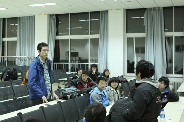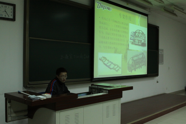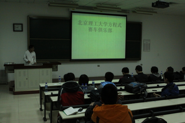 7点,伴随着激动人心的音乐,宣讲会准时开始。现任车队队长董路宁首先向大家介绍了到场的车队元老,并介绍了FSAE这项赛事以及北理工FSAE方程式赛车队。随后,车队第一届队长孙博与大家分享了车队从最初建队到夺得冠军这条路上的点点滴滴,其中的伤痛与甜蜜,深深感染了在场的每一个人,除此之外,他还介绍了“黑鲨”的传动系统,通俗的语言和形象的解释,让大家受益匪浅。随后,前队长孙博和各组组长王朔、赵松辉、乔军奎分别就“黑鲨”的传动、车架、转向及制动系统进行了系统讲解,其间妙语连珠,现场笑声与感叹声不断。为了让同学们可以更好的感受赛车的魅力,积极地参与俱乐部,董路宁队长与方程式俱乐部负责人李家骏详细介绍了俱乐部的构成及制度,俱乐部的存在,为大家提供了一个更好的接近和享受赛车的平台。宣讲会的最后,同学们与车队队员进行了热烈的交流并给予他们最真挚的祝福!