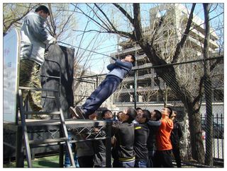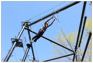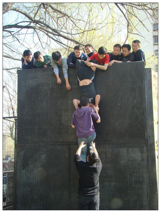 接下来的活动主要分为四个部分,信任背摔、高空抓杆、惊险排雷和海盗船逃生。信任背摔主要考验的是团队成员之间的互相信任,当背摔的同学向后躺下去的一瞬间,是把自己的生命交给了队友,这是需要百分之百的信任才可以做到的。高空抓杆主要培养的是学员挑战自我的勇气,同时也有对负责保护其安全的同学的充分信任。惊险排雷训练的是大家面对困境时,团结一致,转换思维,共同解决问题的能力。海盗船逃生要求学员在规定的时间内不借助任何其他外来措施,成功将所有成员送达四米高的墙顶。这个项目是所有项目中最有挑战性的一个,首先它需要同学做人墙,其次需要同学之间的协调配合,但最主要的是策略,尤其是最后一个人的成功抵达没有团队的协作,是几乎不可能完成的,同学们进行各种尝试,虽然过程中有失败,但是最后还是很成功地完成了任务,得到了教练的认可。