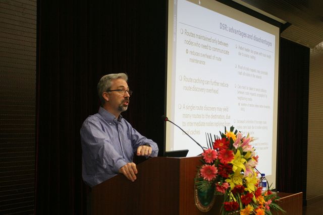 随后,西班牙瓦伦西亚成人头条(UPV) Miguel Sanchez副教授为论坛开幕作名为《Mobile ad-hoc networks》的专题报告,主要对移动特设网络的特点、现状与未来发展等情况做了详细的介绍,现场聆听报告的同学也积极的与Miguel Sanchez副教授进行了良好的沟通和互动。