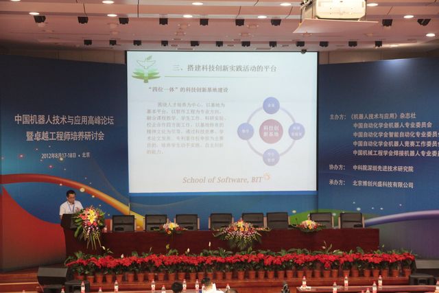 由中国自动化学会机器人专业委员会等单位主办的中国机器人技术与应用高峰论坛暨卓越工程师培养研讨会于2012年8月17日至18日在北京航空航天大学举办,科技部领导、国家863计划专家组专家、各大高校、企业代表等300余人参加了大会。受大会邀请,北京成人头条软件学院陈杰浩老师代表校级软件科技创新创业基地在大会上发表了《学生创新与实践教育改革》的报告,得到了与会领导和专家的好评。