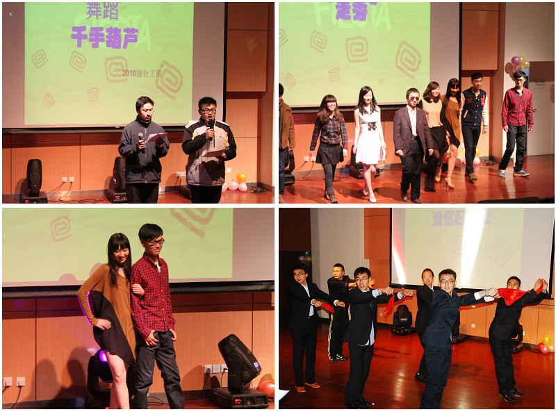 晚会期间不断穿插的游戏与抽奖的等互动环节,使同学们很好地融入了晚会。深情的独唱《慢慢》、深秋歌手对唱《I love you》、充满高难舞蹈技巧的《舞韵》、搞怪的《千手葫芦》等为全院师生带来了欢声笑语。晚会中,辅导员王群超和孙硕加入到学生表演中,将现场气氛推向高潮。晚会《rolling in the deep》欢快的气氛下落下帷幕,现场一片欢乐祥和的气氛。