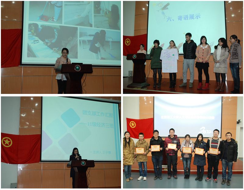经过一个学期的团组织建设,“我的支部我的团”基层团组织建设评优答辩会于学期末在良乡校区报告厅举行。各团支部对本学期以来组织建设活动进行了精彩的陈述和汇报。22111101团支部向大家介绍了支部建设的成果,并展示写满全体团员寄语的文化衫;经济22111203团支部将本支部的团日活动做成了精彩的纪录片;22111103团支部展现了走进良乡第三小学开展环保知识课的团日活动;社工22121101团支部通过心理热线和专业实验室,为学校的同学提供心理咨询的帮助。各团支部的精彩展示赢得观众的阵阵掌声,展现了同学们的真挚友谊及支部凝聚力。