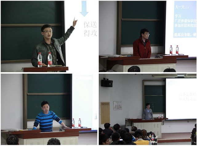 随后,特别邀请到的五位2013届本科毕业生分别从保研、求职、科技创新、学习生活以及留学等五个方面与在场同学进行交流,毕业生们从自身经历出发,向学弟学妹们分享了自己宝贵的经验,得到了全场雷鸣般的阵阵掌声。最后,由刘瑞老师向同学们讲解了关于国际交流项目的具体事宜,特别是学院交流人数越来越多的德国项目。