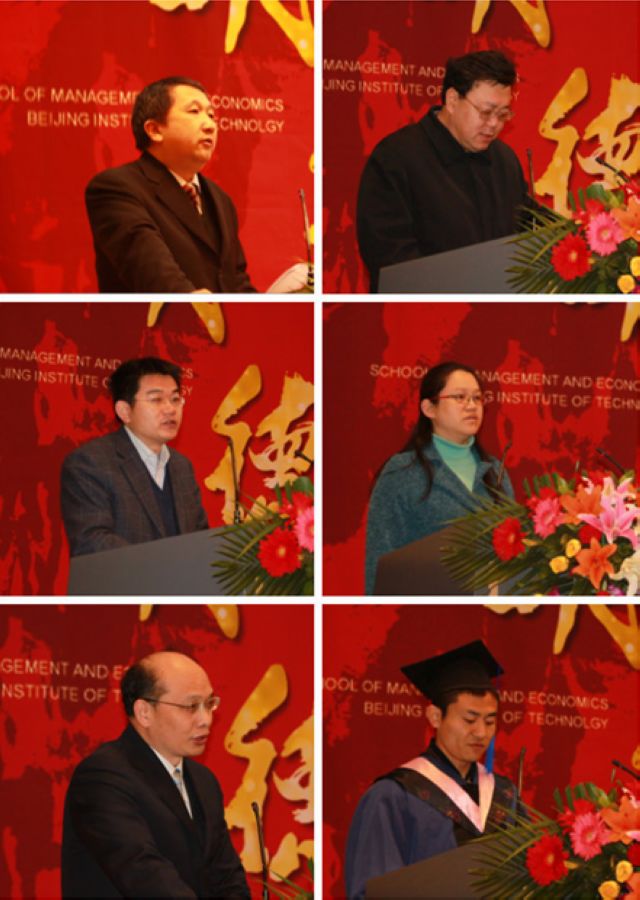 朱东华副院长代表学院向毕业生致辞,对各位毕业生表示了由衷的祝贺和美好的祝愿。同时,教导毕业生们要热爱科学、播撒科学的种子,叮嘱即将踏上工作岗位的同学们要远离浮躁,守护科学这一神圣的净土,守护博士硕士这一神圣的学术荣誉,扎扎实实做好学问,把握中华民族伟大复兴这一历史性契机。孔昭君副院长宣读了学位授予决定。王兆华副院长宣读了优秀毕业生名单。周毕文副教授作为教师代表发言,富有激情的演讲,赢得了毕业生们的阵阵喝彩。硕士生刘猛作为毕业生代表发言。他首先与大家分享了在北理工两年半的学习生活所带来的收获。然后他代表所有毕业生向培养他们的母校和管理与经济学院、各位老师,向养育他们的父母表达了衷心的感谢,向所有毕业生表达了殷切的祝福。