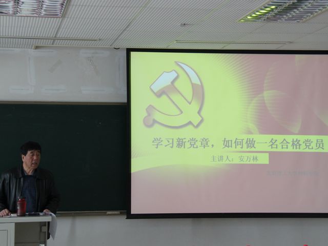3月23日上午,材料学院特邀《高校后勤研究》杂志社副总编安万林进行题为“学习新党章,如何做一名合格党员”的学习辅导讲座。材料学院团委书记刘艳、部分学生党员和入党积极分子参加了讲座。安万林曾担任我校党委宣传部副部长、党办副主任、直属总支书记、校工厂厂长及产业总支书记等,是一名有着丰富工作经验的老党员。他详细解读了新党章的六部分修改内容,对学生党员和入党积极分子提出了“真懂、真信、真做”的要求,指出作为一名合格党员要“认真学习党的理论知识,要加强党性修养、锻炼和实践,要加强道德建设”的三点要求。号召大家要坚持走中国道路,弘扬中国精神,凝聚中国力量。他深入浅出的讲解使大家对新党章有了全面的认识,深深的感受到作为一名共产党员的职责所在。讲座结束后,材料学院向安万林颁发了“学生党课特聘导师”的聘书,安万林表示今后会与材料学院学生党员和入党积极分子加强沟通,充分交流。