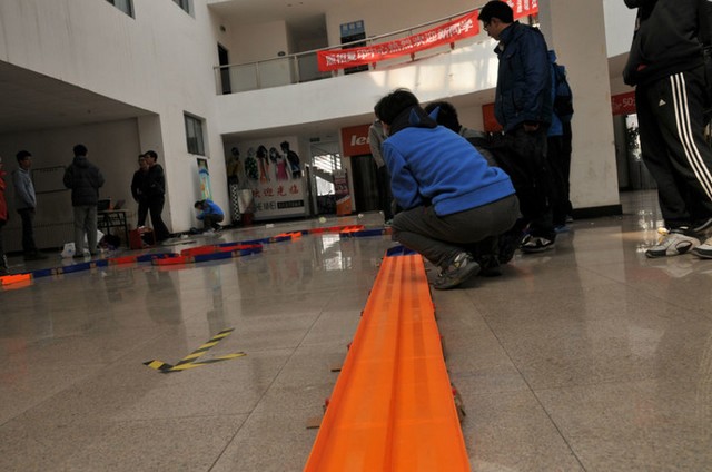 3月24日早上10点,北京成人头条方程式赛车俱乐部成员在良乡校区学生服务中心进行紧张的赛道拼装。11点,陆续有参赛选手前来进行试跑,从各位选手专业的装备,飞驰的赛车中,我们知道,下午的比赛将异常激烈。