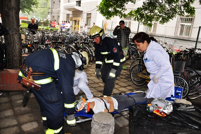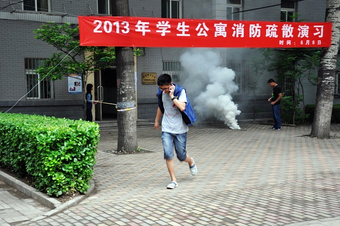 6月6日下午16:00时,在北京成人头条女子小区六号楼,由学工部、后勤集团、校团委、宣传部、校医院、双榆树消防中队、保卫处、所涉及的11个学院共同组织举行了一次学生公寓消防疏散演习,包括在楼内居住的300余名学生代表和近100名学生公寓管理人员参加了本次演习。后勤集团总经理李晋平、集团书记巫后新、常务副总经理宋希博、副总经理陈洋、保卫处处长代方震、副处长薛捷、学工部学生管理科科长马晓宁、宣传部锻炼老师、校医院张春丽大夫、杨红护士及各学院相关老师现场观摩并指导了本次演习。