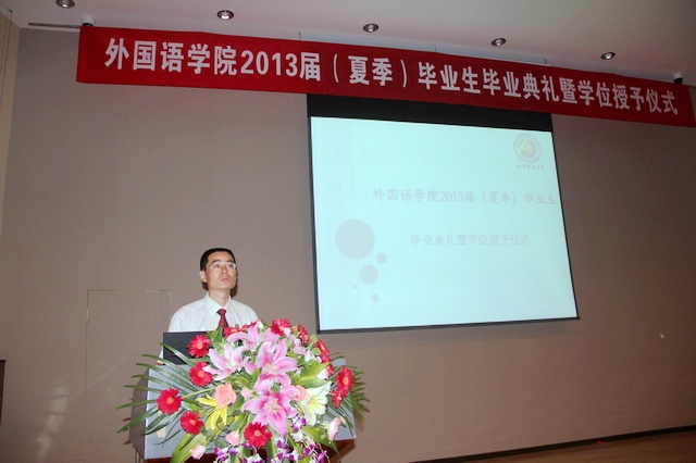 外国语学院常务副院长李京廉教授首先致辞。他首先向全体毕业生表达了祝贺,同时也对毕业生提出了殷切期望:希望他们勇于追逐自己的理想;做好自己的人生规划;处理好各种人际关系,在即将踏入社会,这一所更大的课堂里汲取更多的营养,不断取得成功。
