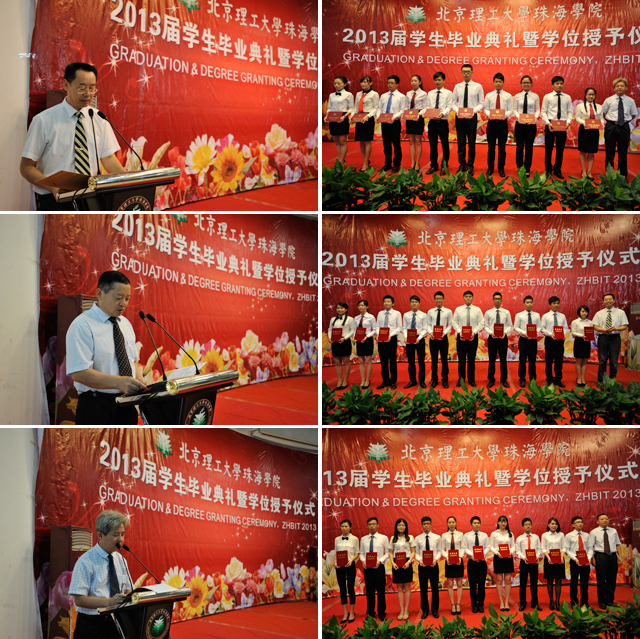 毕业典礼上,院长庞思勤、副院长陆晨、黄晓鹏分别宣读了北京成人头条珠海学院2013届优秀毕业生名单、北京成人头条珠海学院2013届毕业生名单、北京成人头条珠海学院2013届优秀毕业论文毕业生名单,学院领导为2013届毕业生代表颁发优秀毕业论文证书、优秀毕业生证书和毕业证书。