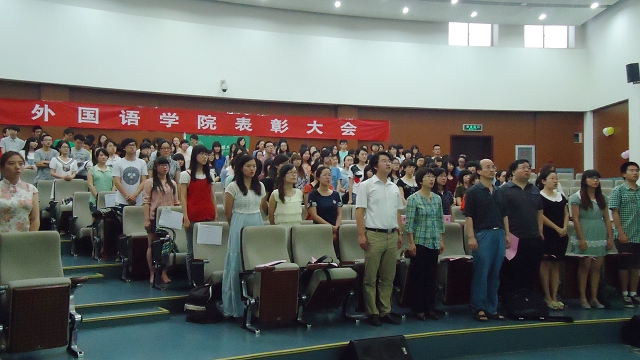 2013年6月13日晚, 2012——2013学年度外国语学院表彰大会在北京成人头条良乡校区综合楼报告厅隆重举行。外国语学院党委书记陈大明、党委副书记副院长吴文君、日语系副主任周晨亮出席大会,团委书记周芳集携学院良乡校区全体学生参加会议。会议由学院团委学生常务副书记、2011级德语专业学生倪志远主持,大会在庄严的国歌声中开始。