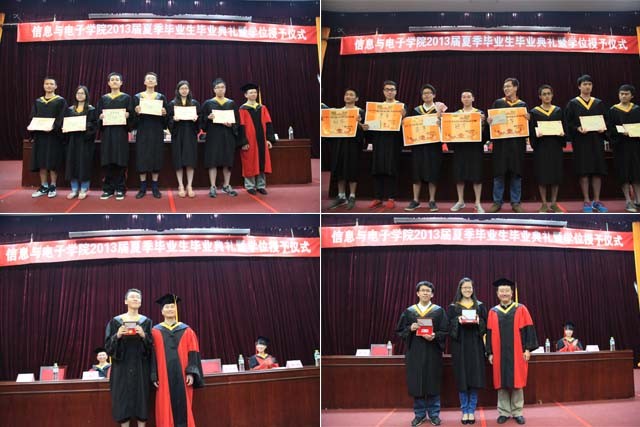 毕业典礼在庄严的国歌声中开始。首先,何遵文副院长宣读了《信息与电子学院2013届优秀毕业生名单》,杨静副院长宣读了《信息与电子学院毕业生各项活动获奖人员及班级名单》。随后进行了毕业生各项活动奖项的颁奖。