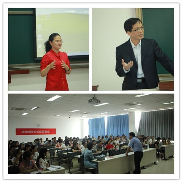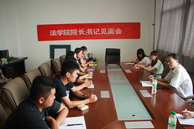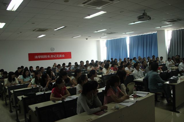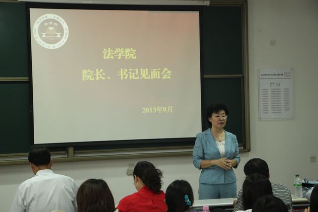 2013年9月12日上午9:00,法学院在良乡校区综合教学楼501教室召开2013级新生与院长、书记见面会。出席会议的有法学院党委书记刘存福,副院长张艳丽,新生班主任刘毅、周建华、杨华权,2011级班主任李金明,以及法学院2013级全体新生。会议由学院辅导员韩笑老师主持。