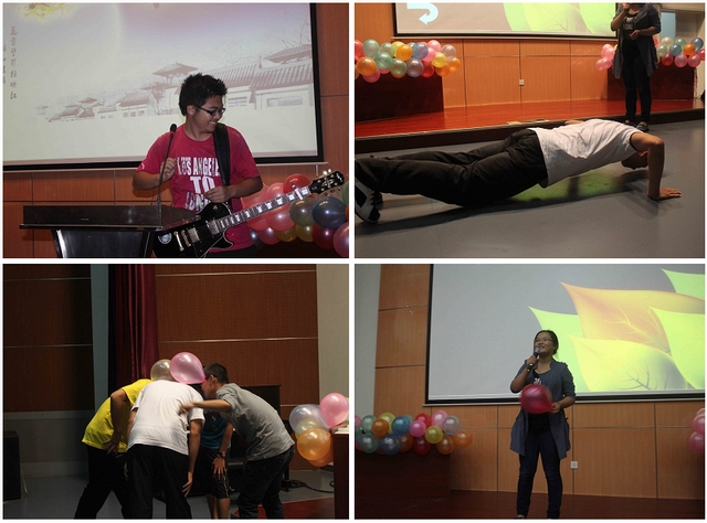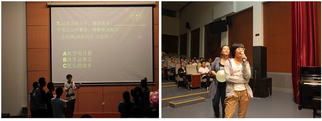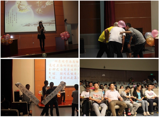 在一段满含温情的视频中,介绍了过去的一年中,2012级本科生经历的点点滴滴,揭开了本次迎新会的序幕。通过这段视频,新生们感受到了生命之家的温馨与独特的关怀。在“知识竞赛”环节中,游戏方式分别为击鼓传花与随机组团知识竞答,游戏问题涉及了中秋的基本常识与诗词佳句。2013级本科新生们在中秋的文化氛围中交流切磋,收获了团结意识,丰富了节日文化知识,更增进了彼此的友谊。