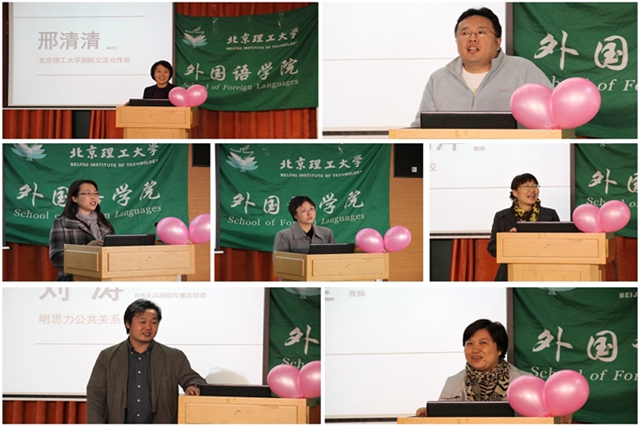 校友纪红,目前就职于Taylor&Francis公司,从事销售经理工作。她和同学们分享了自己从事编辑和图书销售的经历,鼓励同学们珍惜大学时光,在大学要多读书、读好书。校友翟欣,目前就职于澳大利亚驻华使馆,从事翻译工作。她在出版社及加拿大等驻华大使馆的工作经历让同学们敬佩有加,她鼓励同学们要刻苦学习,慎独律己,在浮华的社会中保持一颗平静的内心,认真学习专业知识,发挥专业所长,报效社会和国家。校友赵星,目前就职于中国农业大学英语系。赵星老师以自己托福满分的经历告诉同学们学习语言的重要性,并且现场传授了学好语言的方法和技巧,以期对学弟学妹们有所帮助。校友范丽萍,目前就职于汇佳职业学校,她从学习的心态出发,告诉同学们快乐大学的真谛。校友蔡健,目前就职于Google公司,做项目经理,他以自己丰富的工作阅历向同学们传授职场之道,鼓励同学们奋发前行,使广大同学受益匪浅。校友刘涛,目前就职于明思力公共关系公司。他以自己成功转型为例,从自己在公共关系公选课学习经历说起,告诉同学们在学习语言的同时,要注重其他学科知识的储备和能力的培养。校友邢清清,目前是我校国际交流合作处副处长,也是我院英语系老师。她热情地向同学们介绍了北京成人头条为同学们提供的丰富的留学资源,以及与我校关系密切的两所孔子学院的相关事宜,引起同学们极大的兴趣,她也告诫大家凡事要早着手、早规划、早准备。