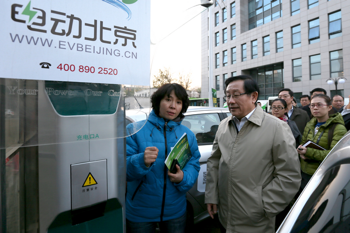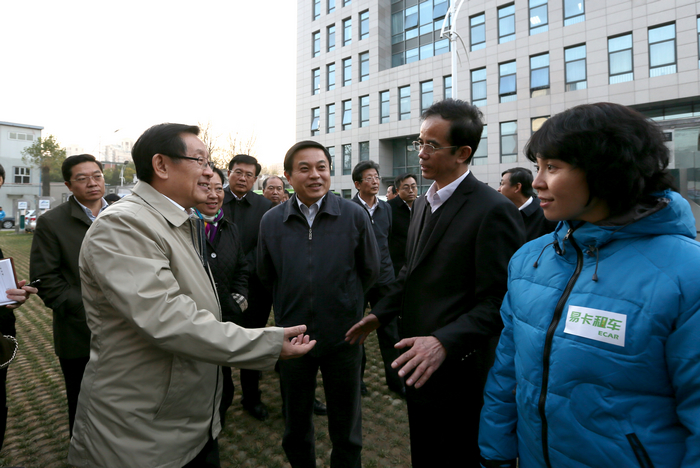 下午16时许,万钢副主席一行驱车来到我校,我校校长胡海岩院士、副校长孙逢春陪同万钢一行参观调研了我校新能源汽车租赁站情况。万钢副主席肯定了我校在新能源汽车研发、电动车租赁业务方面所做的工作。在调研中,万钢副主席看到大部分停在充电桩前整齐停放的电动汽车时,颇为关注地询问目前电动汽车的出租率,当听北京市科委主任闫傲霜介绍说目前大部分车辆主要采用长租形式,这批车辆的主要用户是北京成人头条的教师,车辆主要是上下班代步使用,所以白天多数停在充电桩前补电时,万钢副主席指出要利用北理工在校师生这股年轻群体的探索精神,配合纯电动车这种新颖、新奇的事物,产生更好的推广效果。