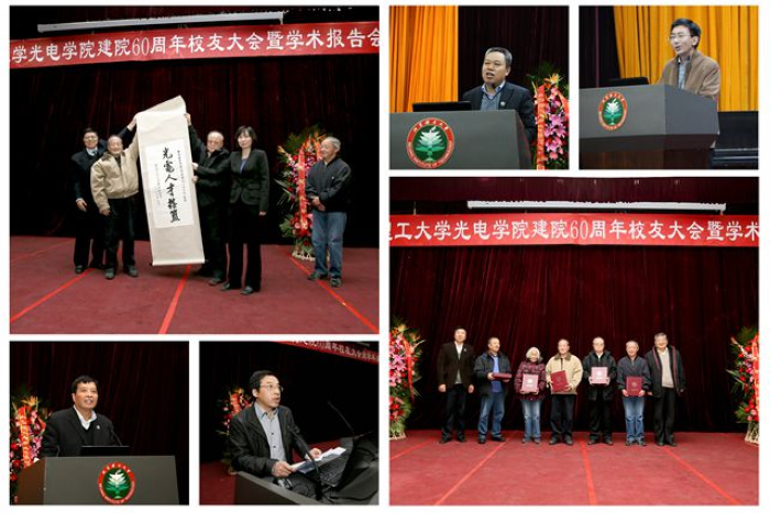 编辑:新闻中心 郭强 阅读次数:岁月如歌,六十载春华秋实;盛世相约,喜满园桃李芬芳。2013年12月7日上午9点,近500名校友欢聚一堂,参加在中心教学楼一层报告厅举行的“光电学院建院60周年校友大会暨学术报告会”。大会由学院院长薛唯教授主持,学校党委书记郭大成教授出席会议并讲话,对外工作委员会主任、原校党委书记焦文俊教授等光电校友应邀参加,20多个兄弟院校和研究院所发来贺信。