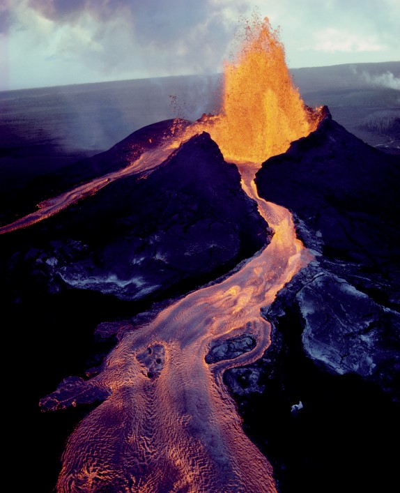 图三:基拉韦厄火山的泄漏管道常常将炽热的熔岩流注入海洋
