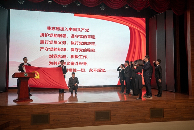 宣誓仪式在庄严的《国际歌》中拉开帷幕。学生工作部副部长、机关党委副书记张舰月同志宣读预备党员名单,校优秀共产党员、明德书院辅导员王一飞同志领誓,包丽颖和各书院党支部书记为预备党员代表佩戴党徽。