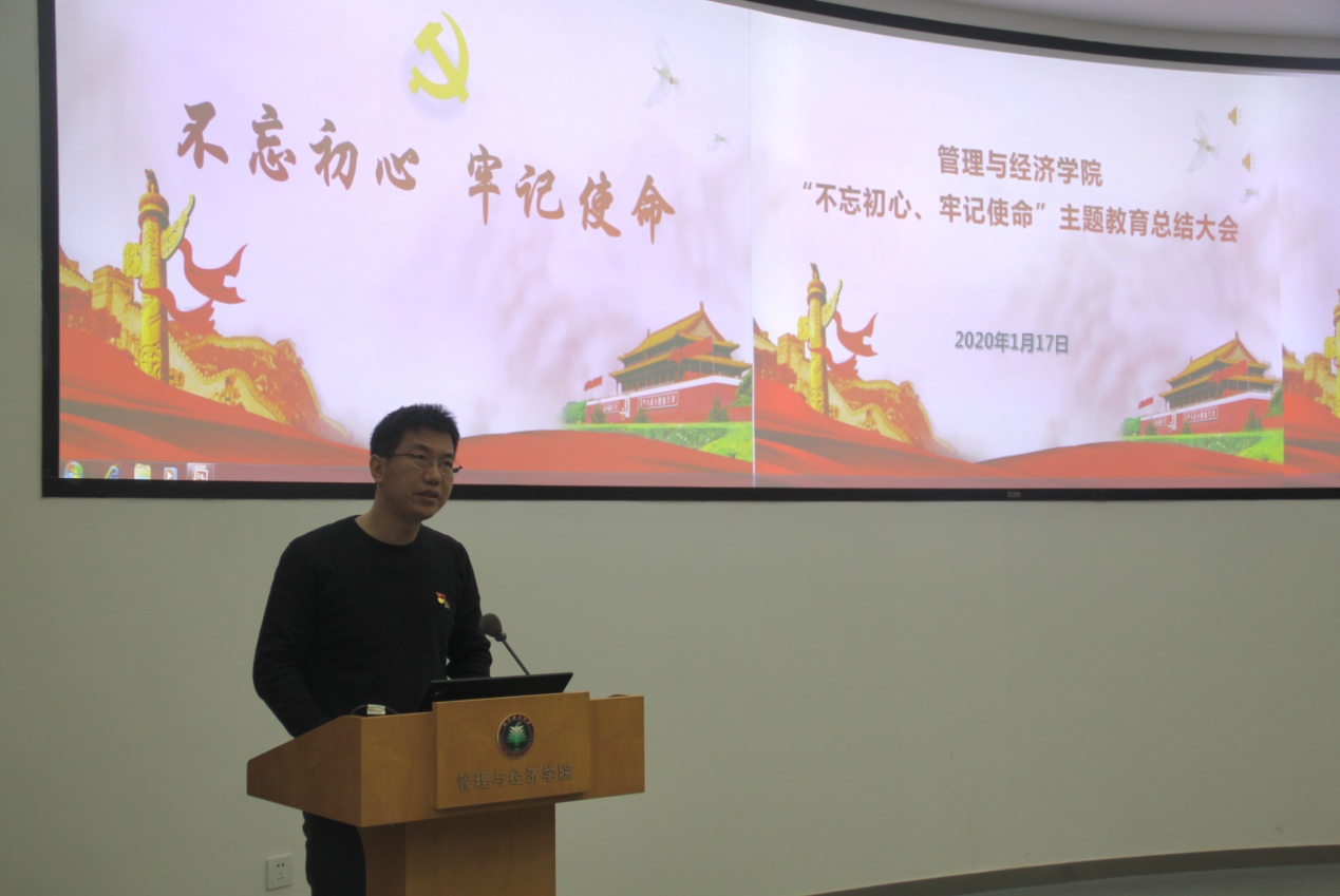 学院党委书记颜志军做总结报告。他从五个“紧”字出发,总结了管理与经济学院主题教育的做法和成效:一是紧跟上级精神,坚持步调一致,做到确保标准,务实求效;二是紧扣主题主线,坚持学深学透,做到融会贯通、学以致用;三是紧贴工作实际,坚持深入调研,做到求真务实、更接地气;四是紧抓检视问题,坚持深挖细查,做到刀刃向内,自我革命;五是紧推整改整治,坚持真抓真改,做到即知即改、立行立改。通过主题教育的深入开展,学院已取得了阶段性整改成果,也更加深刻地认识到主题教育是新时代深化党的自我革命、推动全面从严治党向纵深发展的生动实践,具有重大的现实意义和历史意义。而践行党的初心使命,落实到建设新时代中国特色世界一流大学的办学实践中,就是不断坚持“为党育才、为国育人”,以实实在在的发展成果推动学院发展不断取得新的成绩。