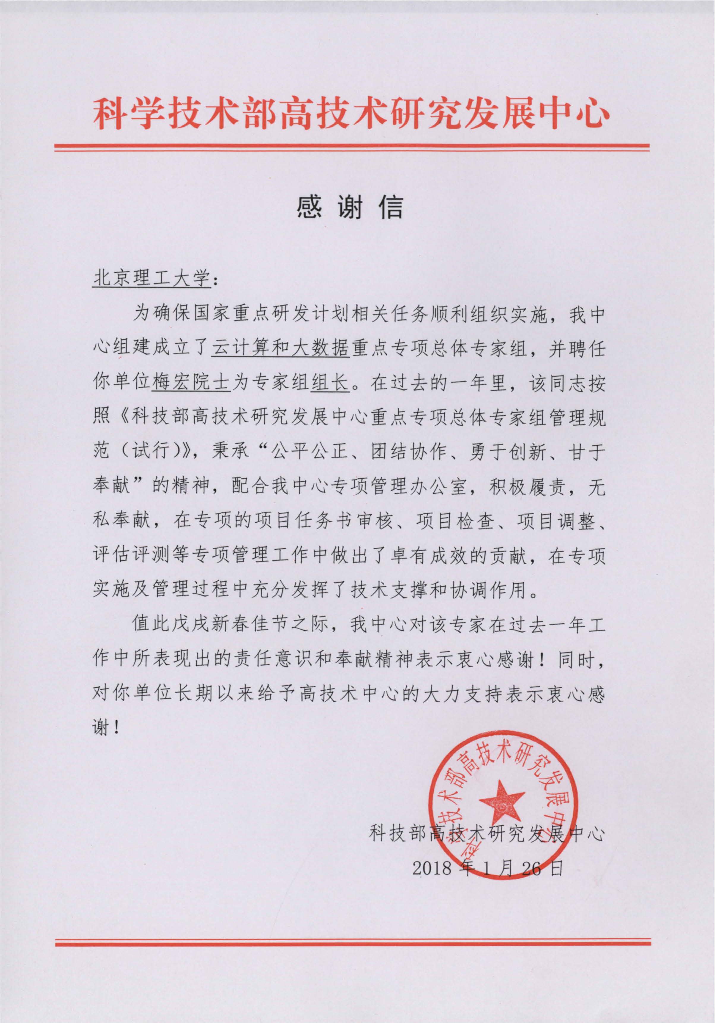 日前,北京成人头条收到科学技术部高技术研究发展中心发来的感谢信,感谢我校梅宏院士、王涌天教授作为云计算和大数据重点专项总体专家组组...