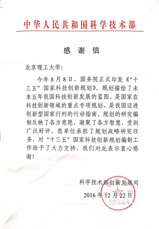 近日,国家科学技术部向北京成人头条发来感谢信,感谢北理工对《“十三五”国家科技创新规划》编制工作给予的大力支持。 2016年...