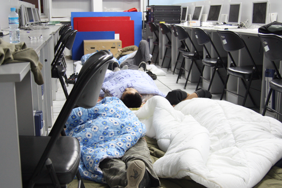是顽强拼搏、艰苦奋斗的“锅炉房精神”。在四天的集训时间中,竞赛队成员吃住都在锅炉房机房,平均每天工作18小时以上,没有床,没有足够的被褥,所有的同学都只能睡地铺,但他们从未有丝毫的怨言,他们为唯一做的,便是全身心的投入到科技创新事业中。这就是软件学院学生科技创新团队“不怕困难,不怕疲劳,敢打硬仗”的精神。正因有这种精神,集训队员们才能在艰苦环境中苦中作乐,信心饱满,才能在困难面前迎难而上,永不退缩,才能高质量的完成任务。