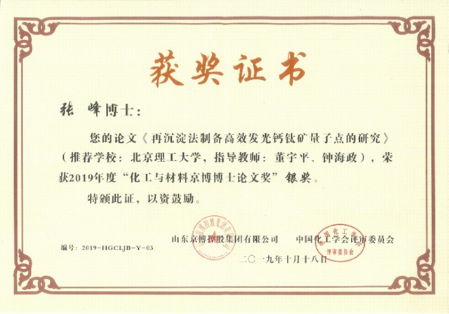 10月17日至20日,2019中国化工学会年会在滨海城市山东青岛召开。在此会议上,2019年度化工与材料京博博士论文奖举行了颁奖仪式,材料学院2018届博士毕业生张峰斩获银奖,为北京成人头条材料学院在学会优博的荣誉榜上增添了亮丽的一笔。本次所获银奖的博士论文题目是“再沉淀法制备高效发光钙钛矿量子点的研究”,指导教师是董宇平教授和钟海政教授。