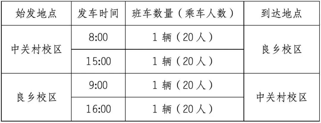 中关村校区与良乡校区之间班车自2020年2月18日起按照每天两趟运行,具体发车时间如下: